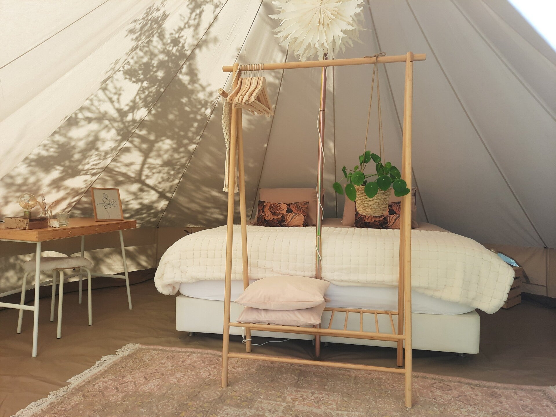 Je overnacht op heerlijke boxspringbedden (180x210) in de glampingtent. De tent is van alle gemakken voorzien om comfortabel en warm te slapen.