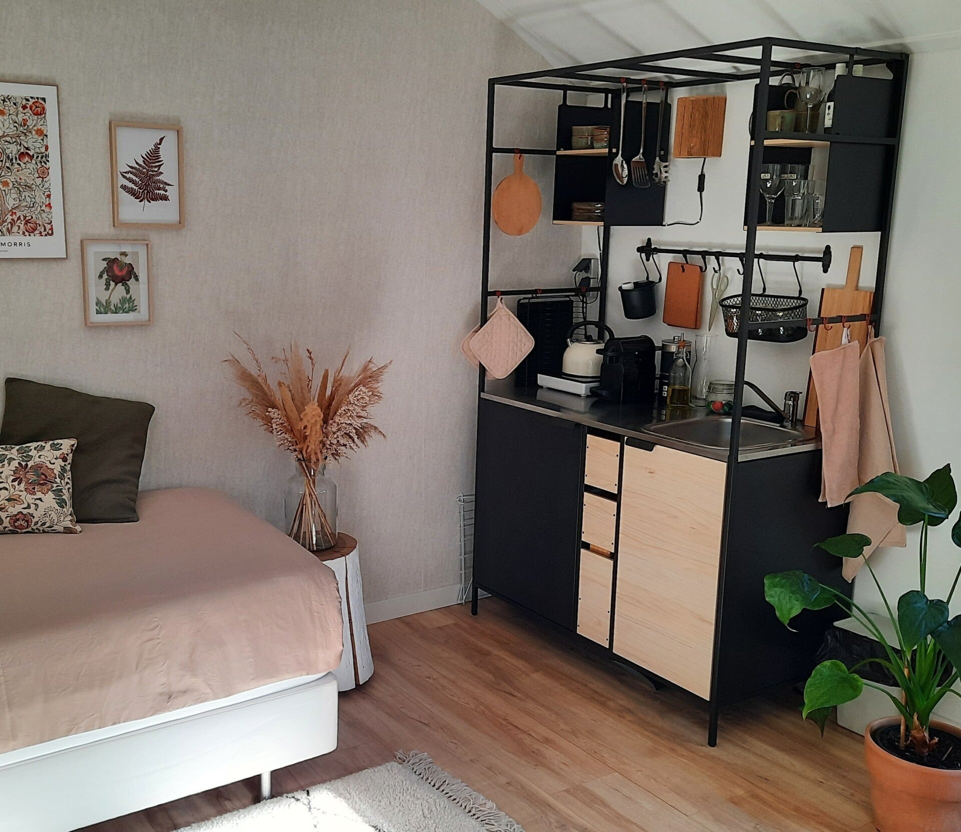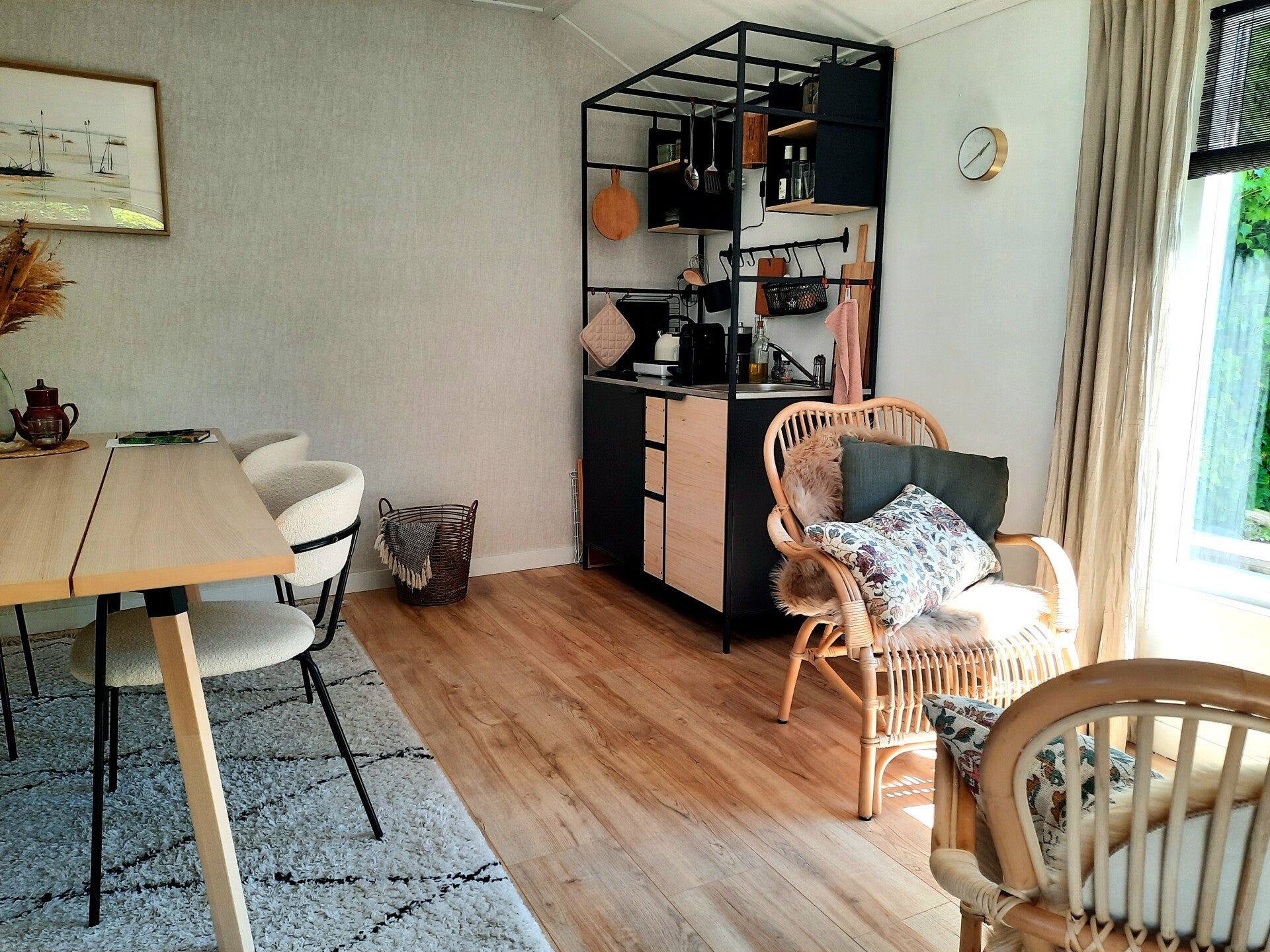 Het sfeervolle tuinhuis heeft een 1 persoonsbed (boxspring 90x210), een keukentje, eettafel en zitje. Het tuinhuis is geïsoleerd en heeft een kachel. Alles is zo ingericht dat je je warm en comfortabel zult voelen. Uiteraard maak je gebruik van alle bovengenoemde faciliteiten.
